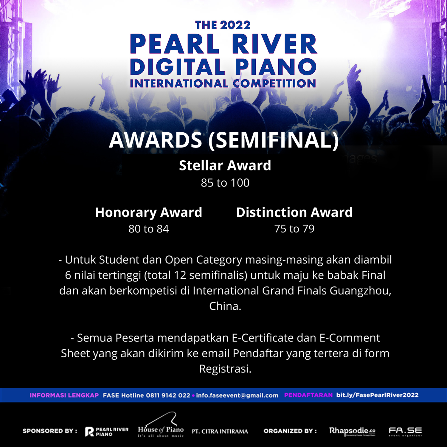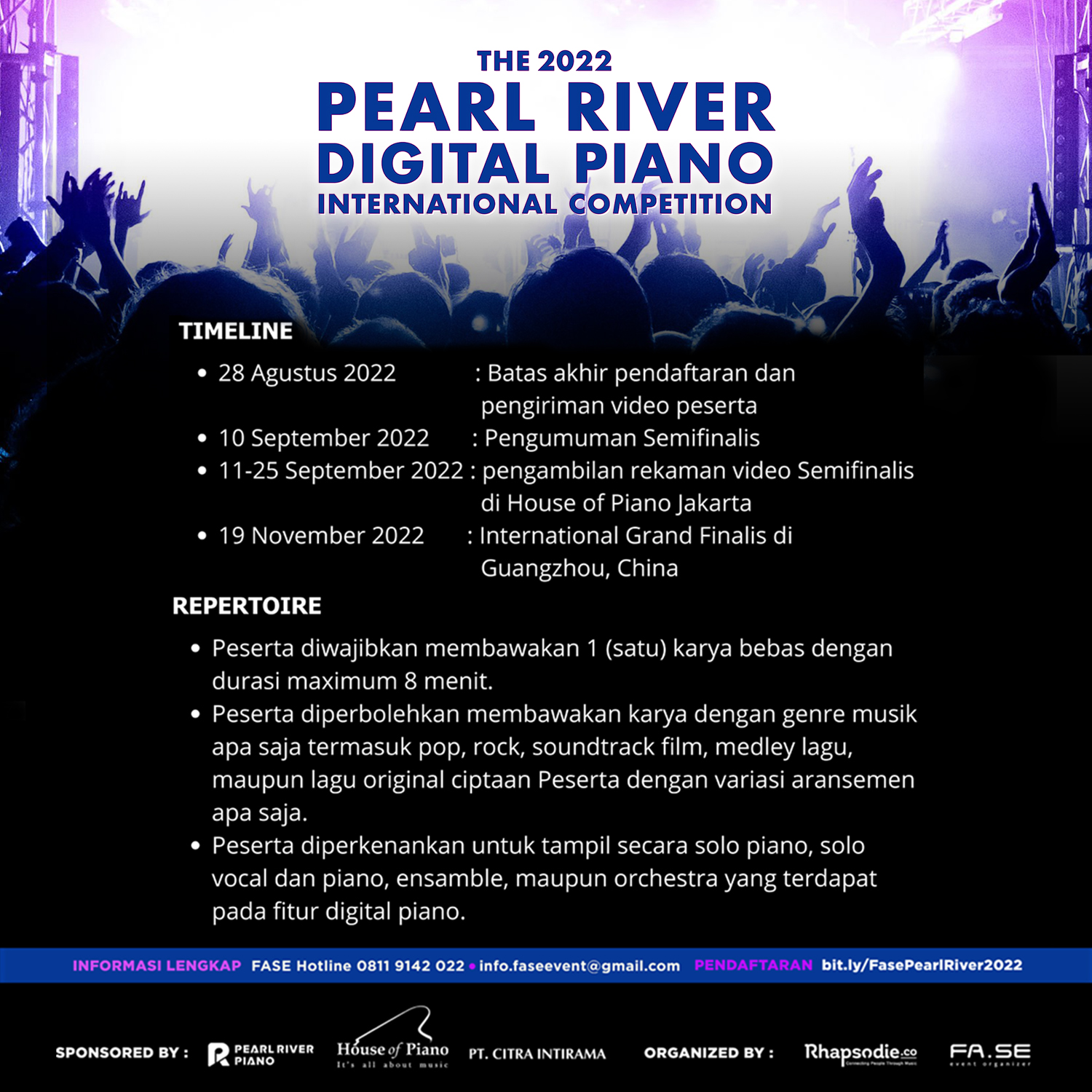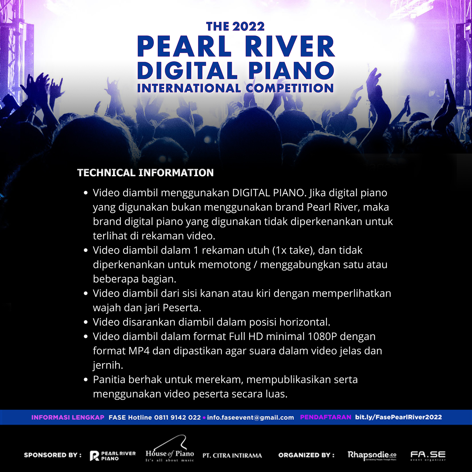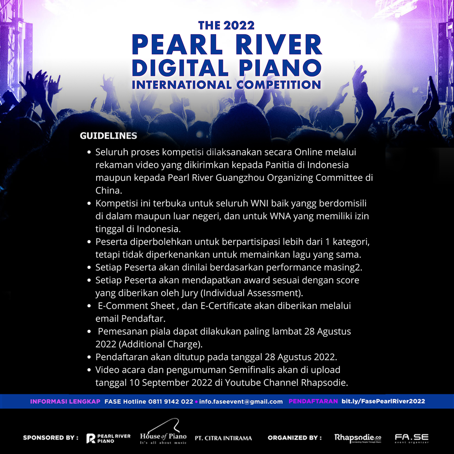Yuk kirimkan video kamu untuk mengikuti kompetisi PEARL RIVER DIGITAL PIANO INTERNATIONAL COMPETITION. Akan ada 12 Semifinalis dari Student dan Open Category (total dari masing-masing kategori) yang terpilih dan akan mewakili Indonesia pada babak International Grand Finals Guangzhou, China.