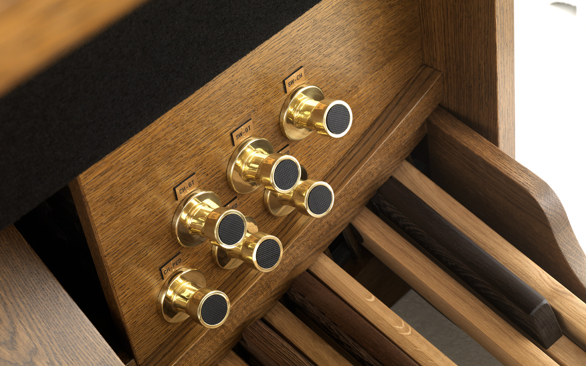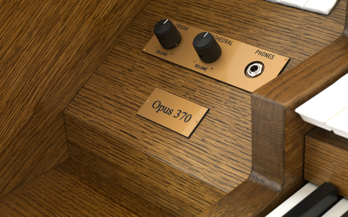 See this for yourself by taking a seat at the two-manual Opus 270, or the three-manual Opus 370. Cast your eye over the instrument and you will notice its diverse disposition of 36 or 42 voices (on the Opus 270 and 370 respectively), operated using illuminated tabs. You will also spot the 32-note AGO pedalboard and three wooden swell shoes.