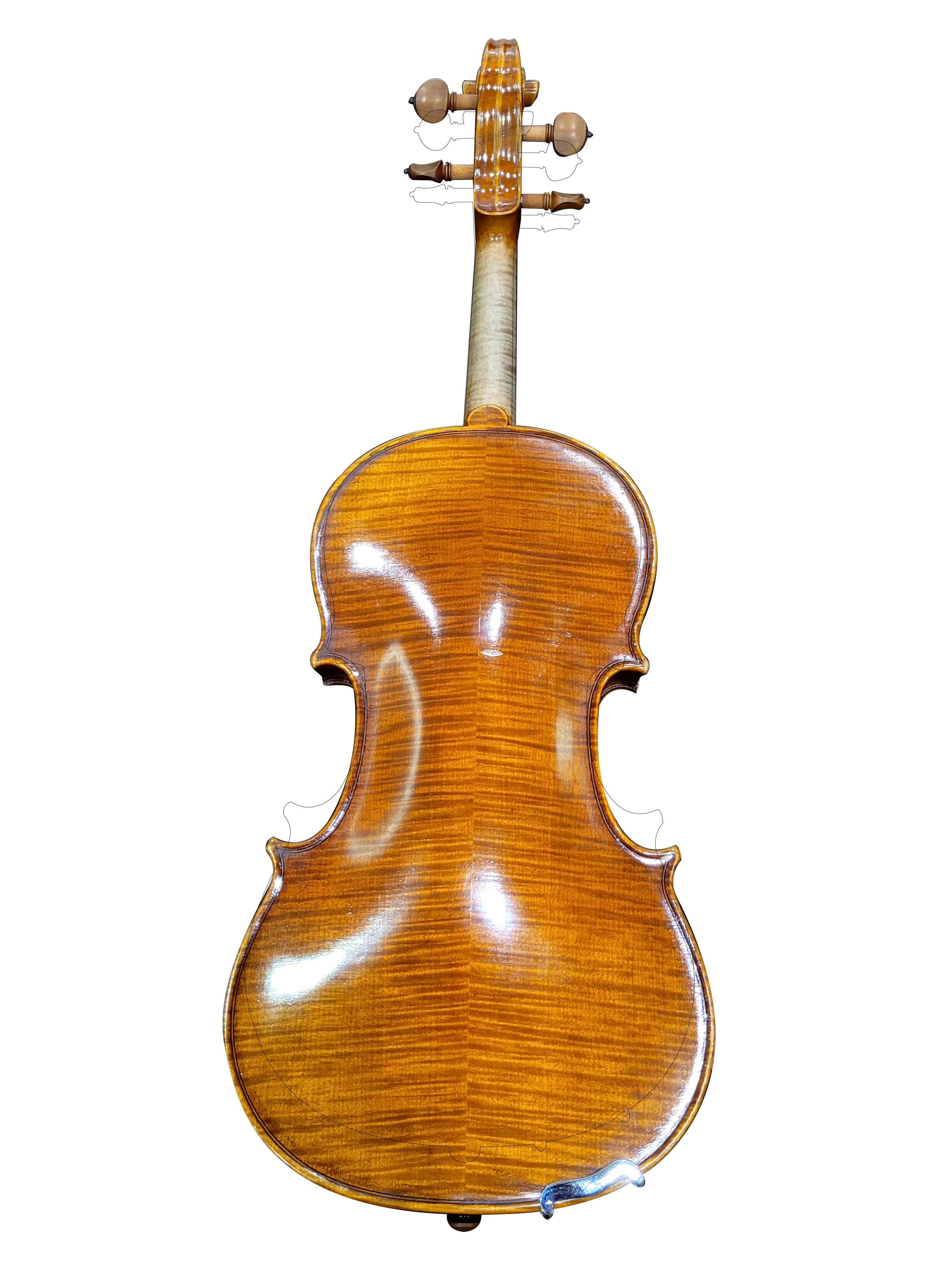 Edgar Russ Linea Mauro Macchi Violin 4/4 Stradivari Model, built in the Master-Workshop of Edgar Russ in Cremona, built without any tropical woods, solid spruce top, solid flamed maple back, pegs, tailpiece and chinrest made of Blackwood (hardened pine) fingerboard, upper nut and saddle made of Blackwood (hardened pine).