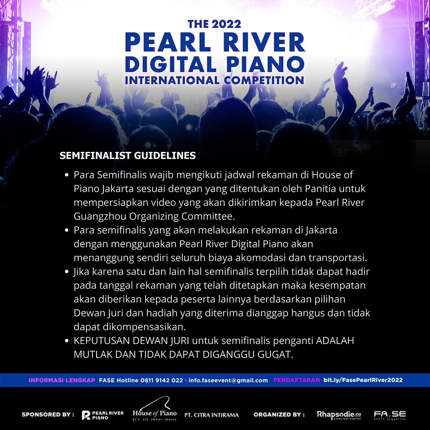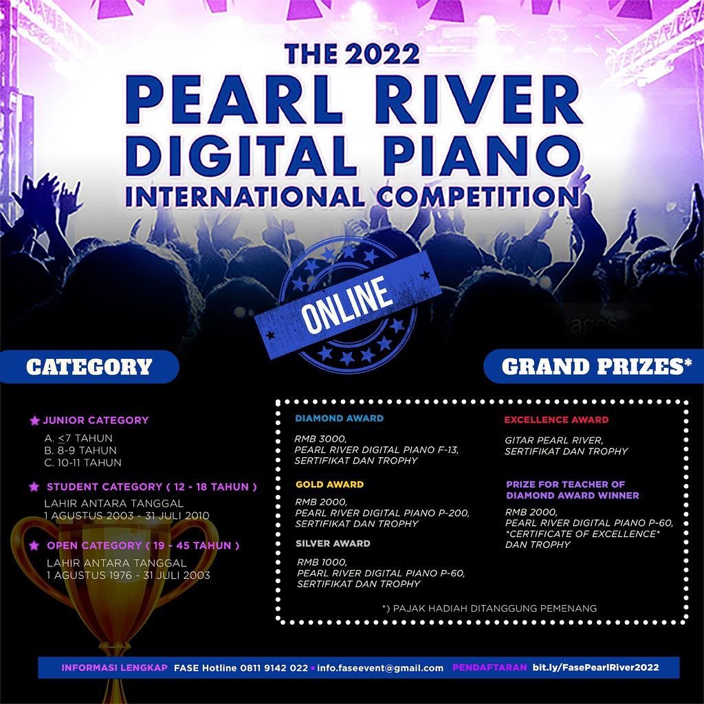 Yuk kirimkan video kamu untuk mengikuti kompetisi PEARL RIVER DIGITAL PIANO INTERNATIONAL COMPETITION. Akan ada 12 Semifinalis dari Student dan Open Category (total dari masing-masing kategori) yang terpilih dan akan mewakili Indonesia pada babak International Grand Finals Guangzhou, China.