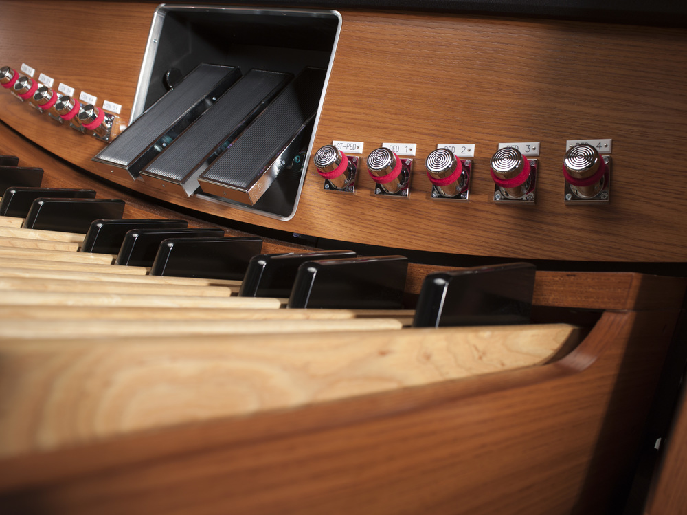 39 STOPS UNBELIEVABLE SOUNDS The Artist Series 599 organ features 3 keyboard manuals with lighted drawknob controls, 10 configurable toe pistons, and 20 internal memory banks. Built-in Hymn Player offers 350 frequently played hymn tunes at the touch of a key, and USB storage allows you to save all organ settings as well as an unlimited number of recorded performances. With authentic pipe organ sound and exceptional flexibility, Artist Series 599 is ready for any repertoire.