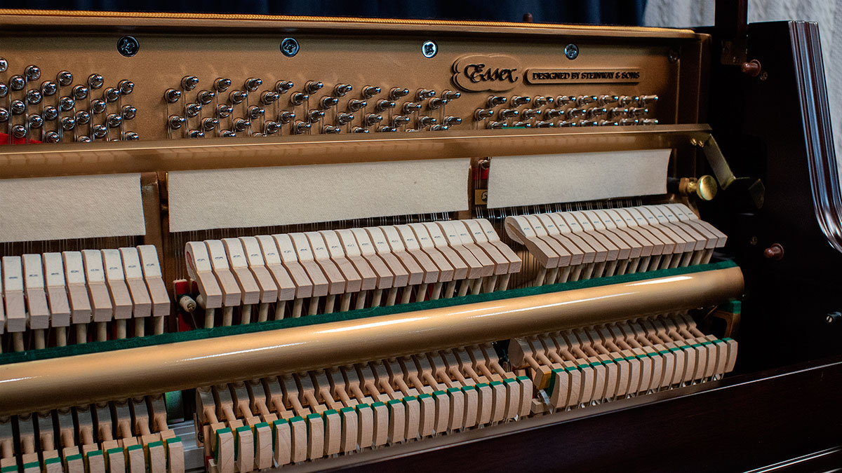 The Essex Upright Piano 116E will do justice to the most diverse styles. Its traditional design and a wide range of veneers. Designed by Steinway and Sons and Shown in Polished Ebony.