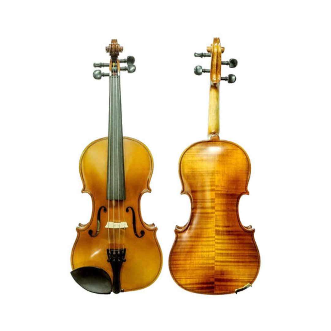 Seasoned spruce top; Seasoned maple back, ribs and scroll with little flame; inlaid purfling; Oil varnish; Ebony fittings; D'Addario Zyex strings; composite tailpiece w/4 fine tuners. Bridge, pegs, fingerboard, nut and soundpost assembled, dressed, fitted and tonally adjusted in our Kansas City workshop.