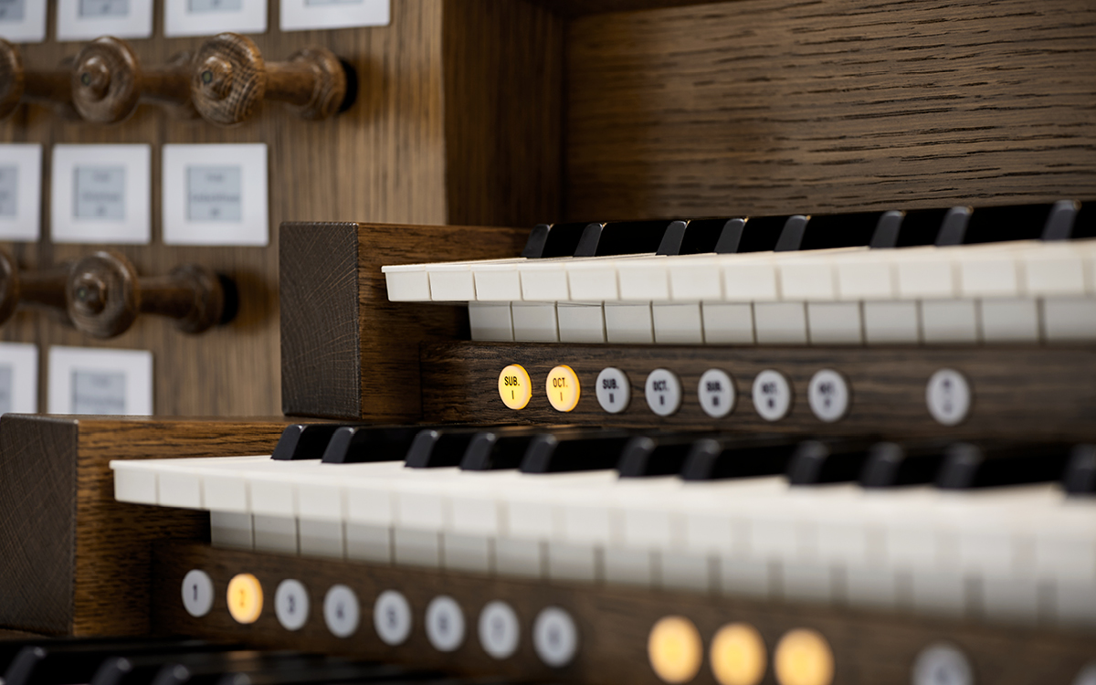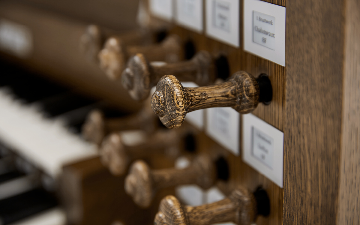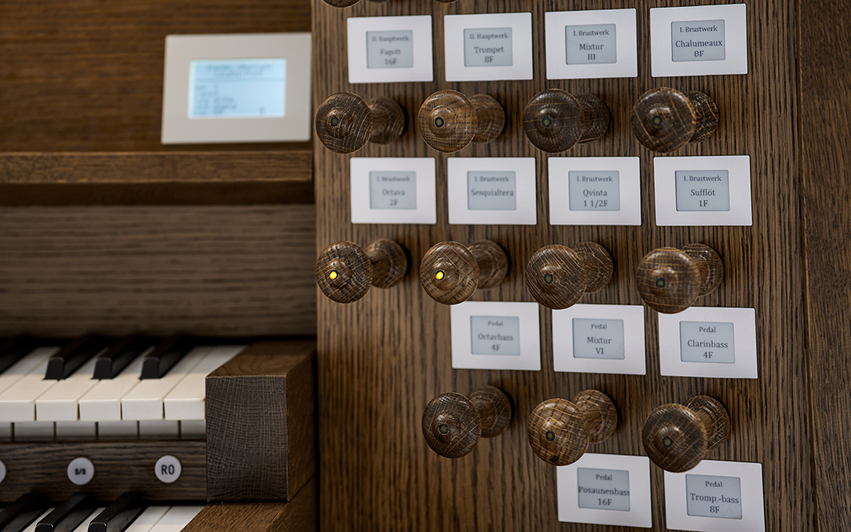 Every register on the Johannus LiVE comes with a small dynamic display that allows you to switch effortlessly between the stoplists of various pipe organs. To illustrate: the register that indicates a Principal 4’ on the Cavaillé-Coll organ in the Église Notre-Dame d'Auteuil in Paris is a Gemshorn 4’ on the Bätz-organ in the Dom cathedral in Utrecht. The displays show the appropriate stoplist depending on which organ is currently being played. The registers are arranged by operating the wooden drawknobs, approximating the same experience as playing the selected authentic pipe organ.