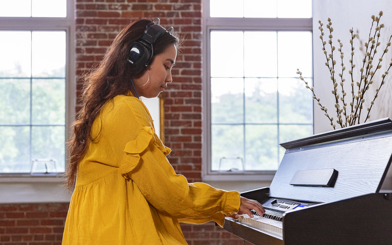 Featuring a stylish and easy-to-assemble black wooden piano stand with a built-in music rest and three pedals (sustain, soft, sostenuto) and an adjustable piano bench, the Virtue includes everything that a beginning piano players needs to get started.